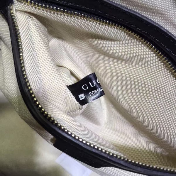 De tas heeft een prominente frontale in elkaar grijpende GG -logo -patch, lederen schouderbanden en een decoratief messing knobbelde kwastje. De bovenkant van de tas opent naar een interieur van een beige linnen en omvat ritssluiting en patchzakken. This purse is an ideal statement bag.