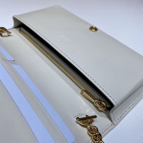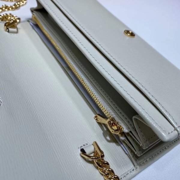 De kettingportemonnee wordt geïntroduceerd als onderdeel van de Gucci 1955 HorseBit Accessories -collectie, gemaakt van blauw leer met een polka -patroon dat is gekend met het dubbele G -motief. Gedefinieerd door de dubbele ring en het barontwerp ook te vinden in handtassen, de gevouwen Snap Closure-vorm heeft verschillende kaartslots en zakken, voltooid met een afneembare kettingband card slots